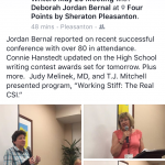 Jordan Bernal reported on recent successful conference with over 80 in attendance. Connie Hanstedt updated on the High School writing contest awards set for tomorrow. Plus more. Judy Melinek, MD, and T.J. Mitchell presented program, “Working Stiff: The Real CSI.”