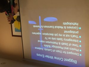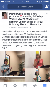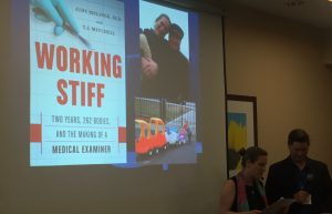 Jordan Bernal reported on recent successful conference with over 80 in attendance. Connie Hanstedt updated on the High School writing contest awards set for tomorrow. Plus more. Judy Melinek, MD, and T.J. Mitchell presented program, “Working Stiff: The Real CSI.”